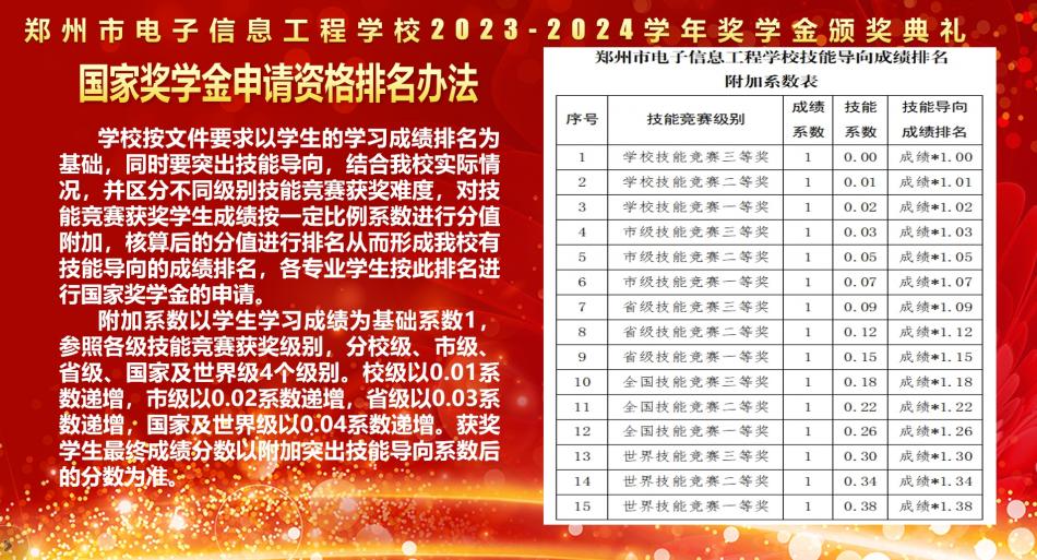 2025年4月23日,郑州市电子信息工程学校务实楼三楼报告厅内,隆重举行了2023-2024学年中职国家奖学金暨学校奖学金颁奖仪式。